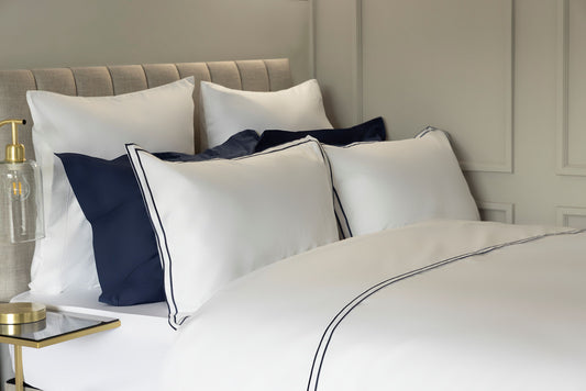 Egyptian Cotton Savoy Duvet Cover Set in White & Navy Blue