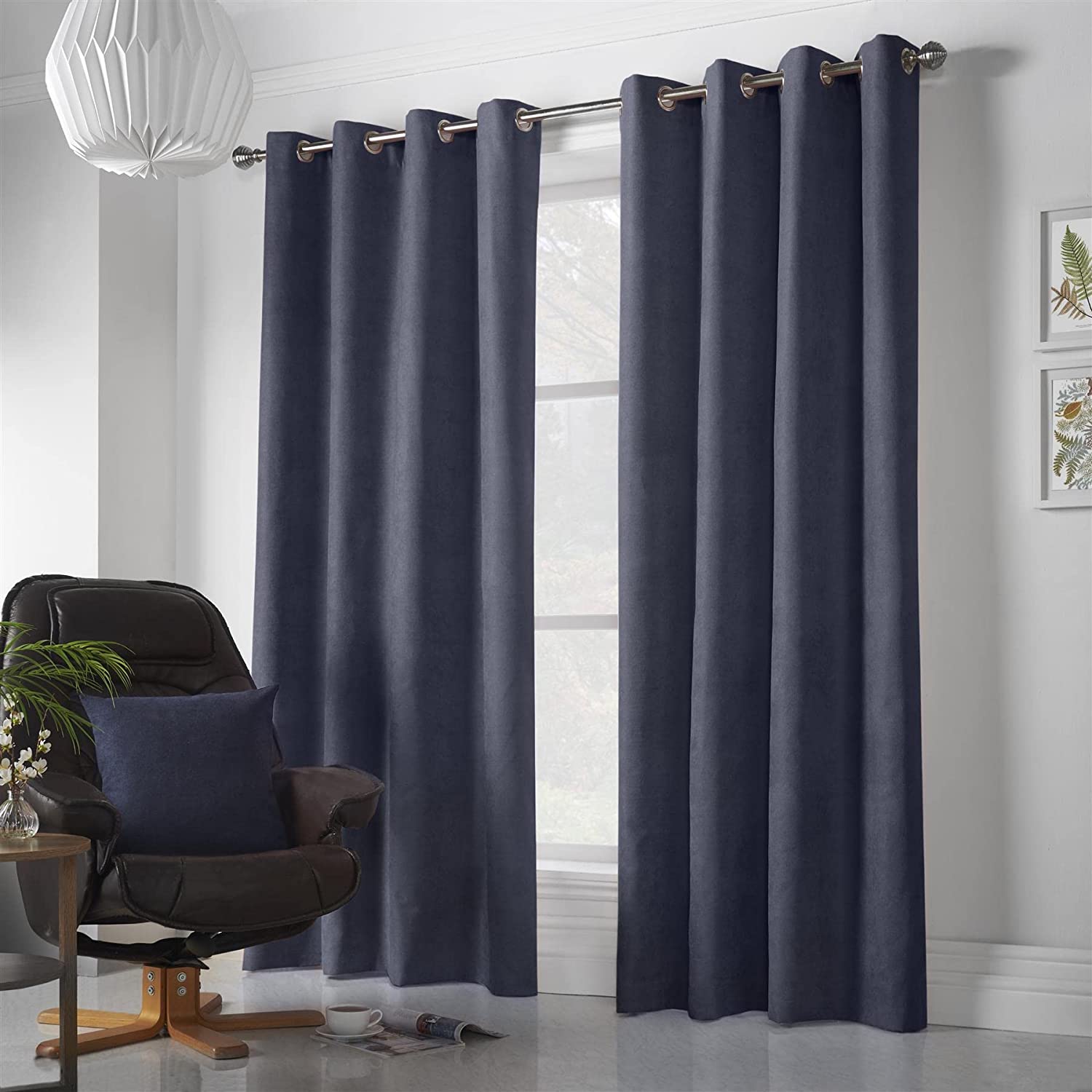 - Chenille velvet room darkening lined curtains in navy blue with a textured finish are available in an eyelet design
