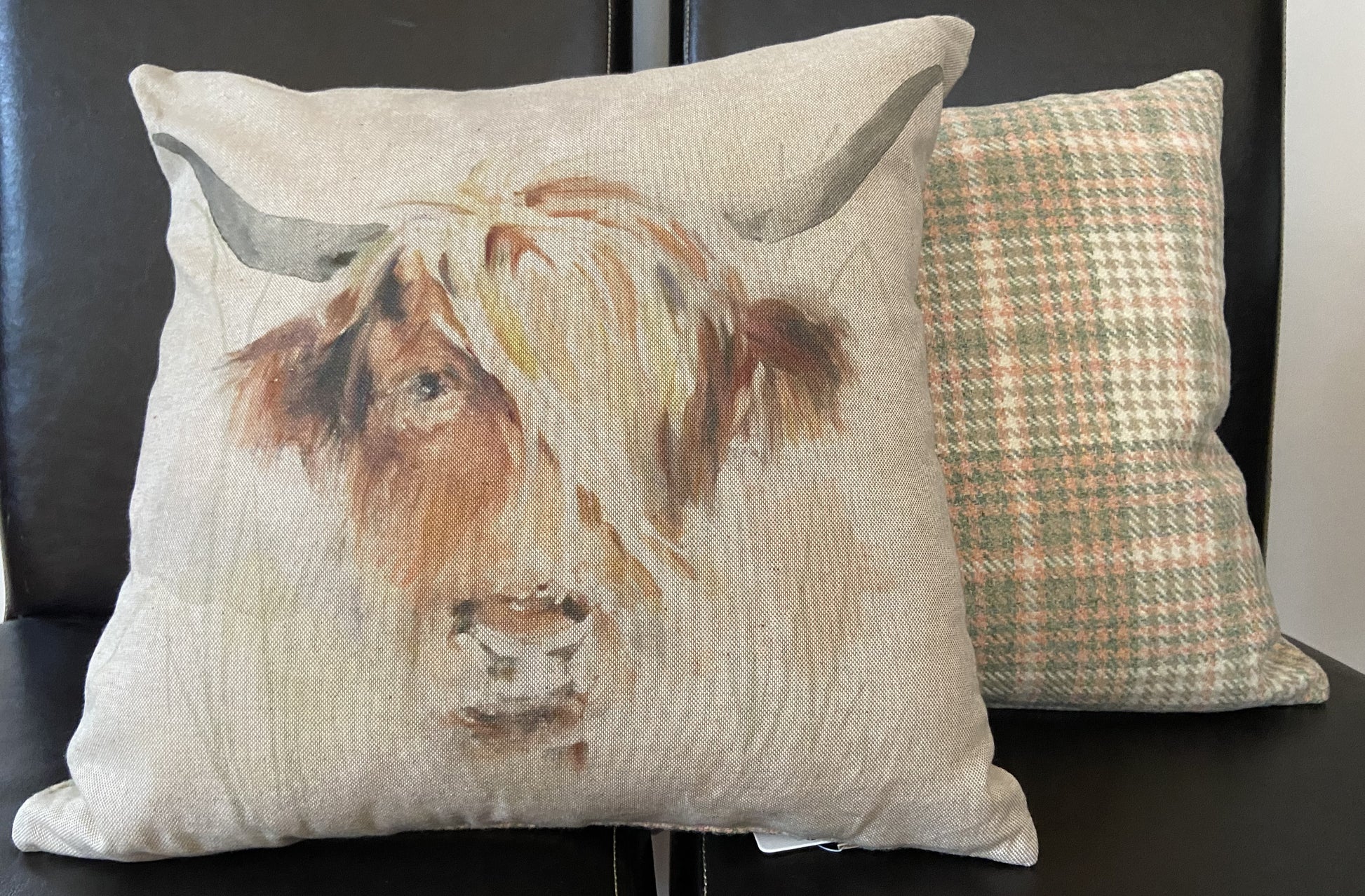 The front is an image of a highland cow and the reverse is a soft tweed like material