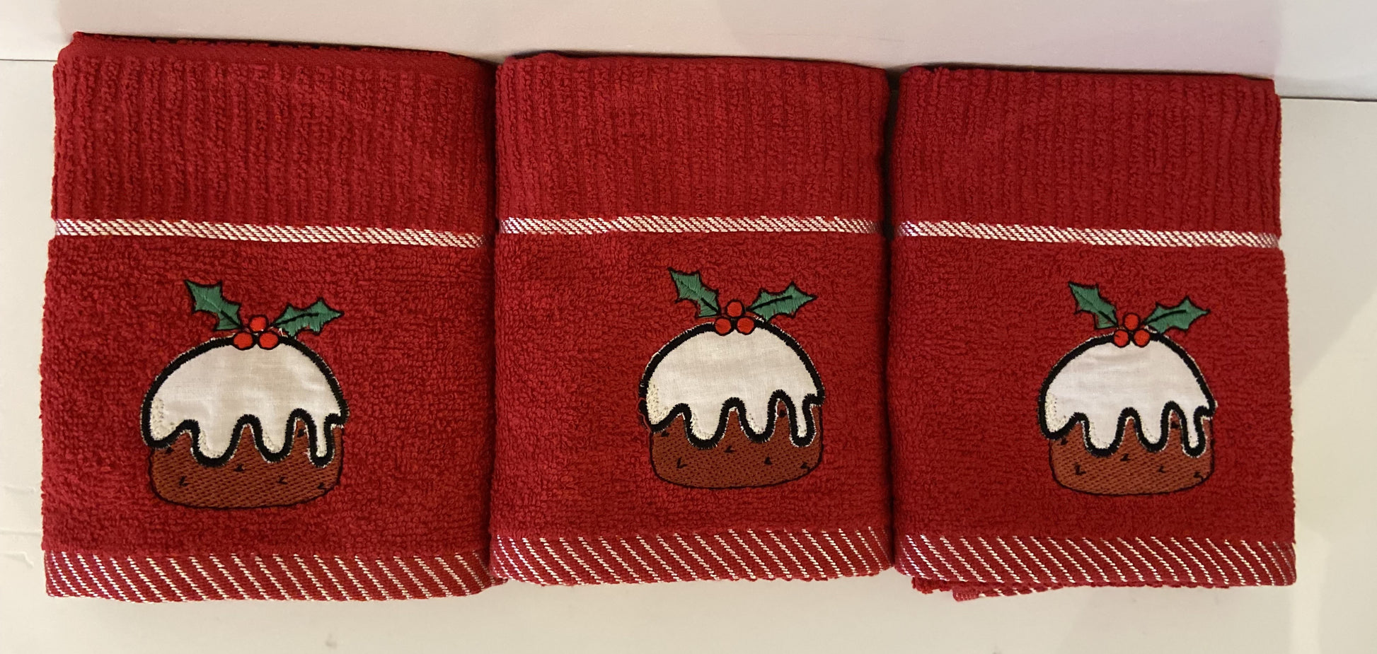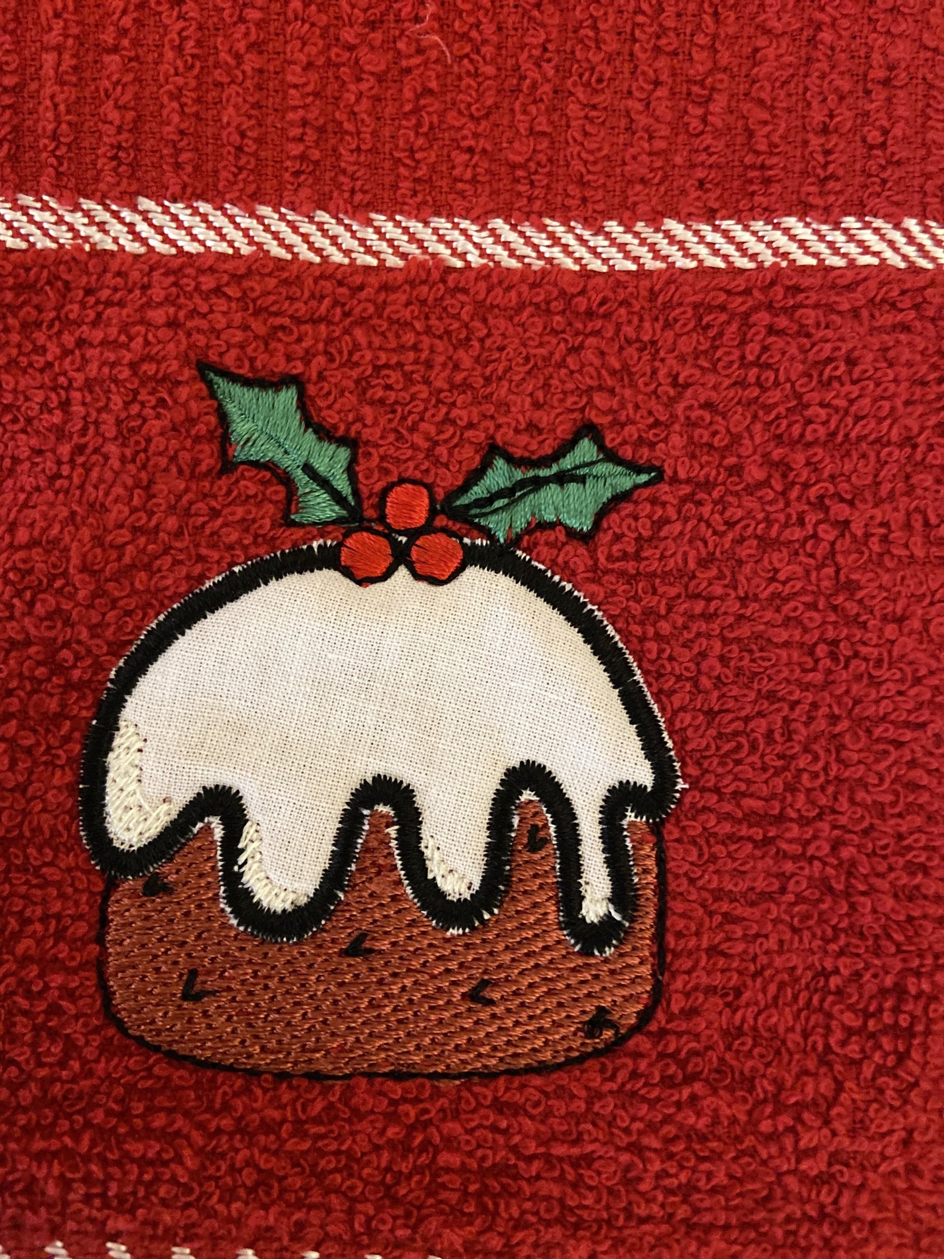 The design is a Christmas Pudding embroidered in to the bottom of the towel
