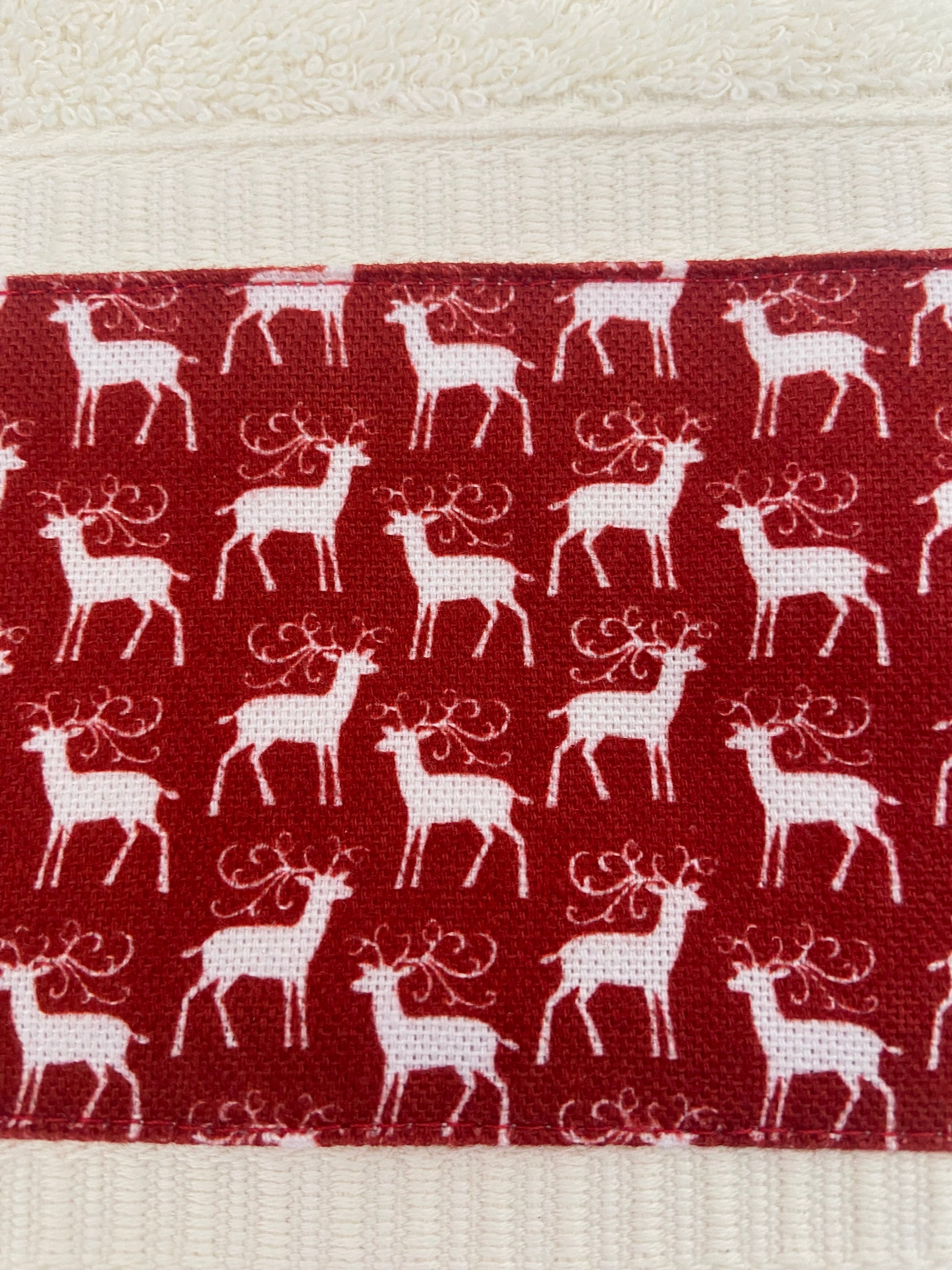 Christmas hand towel in cream with a trimmed edge of reindeers on a red background to the bottom of the towel
