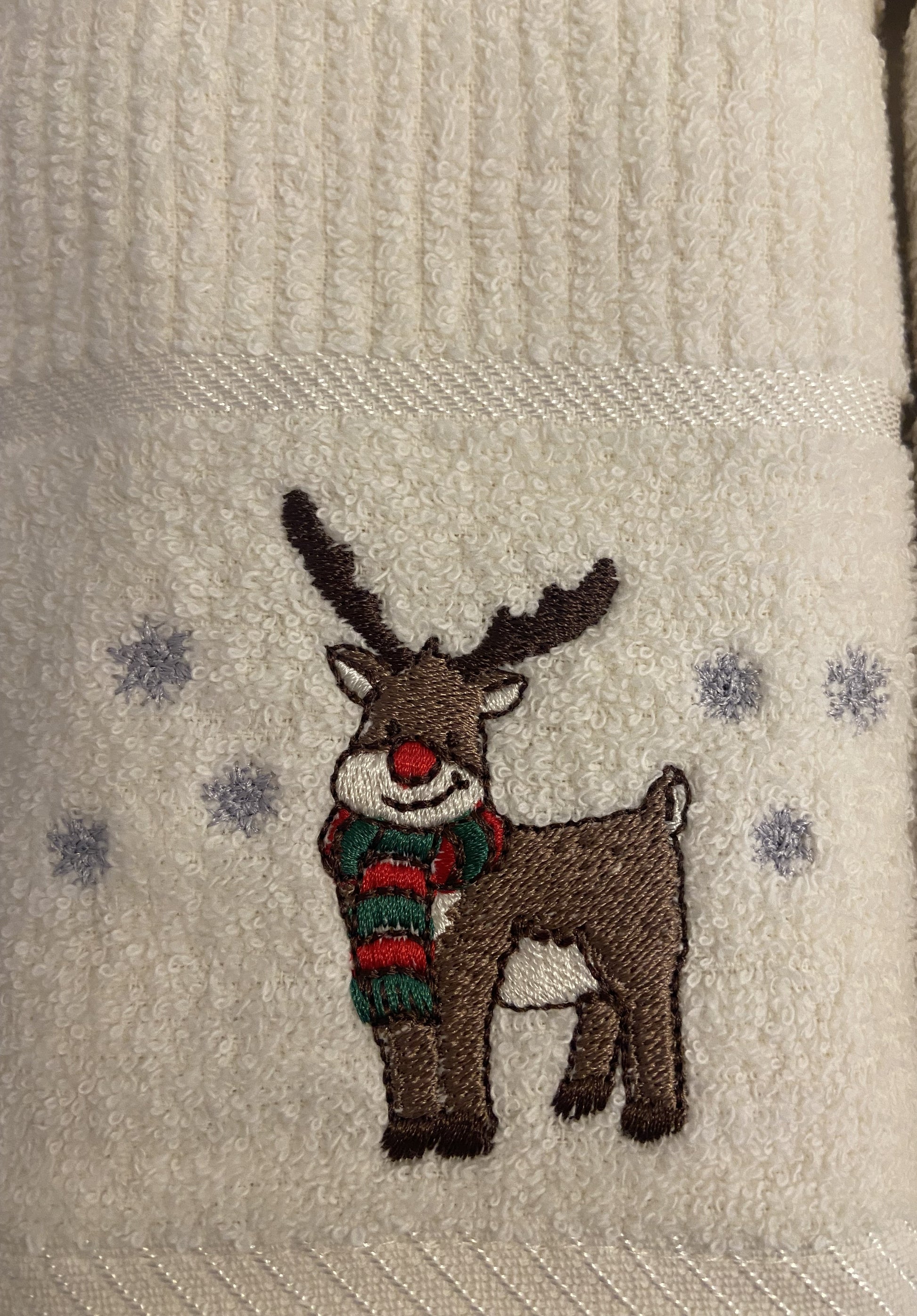The design is a Christmas reindeer embroidered in to the bottom of the towel