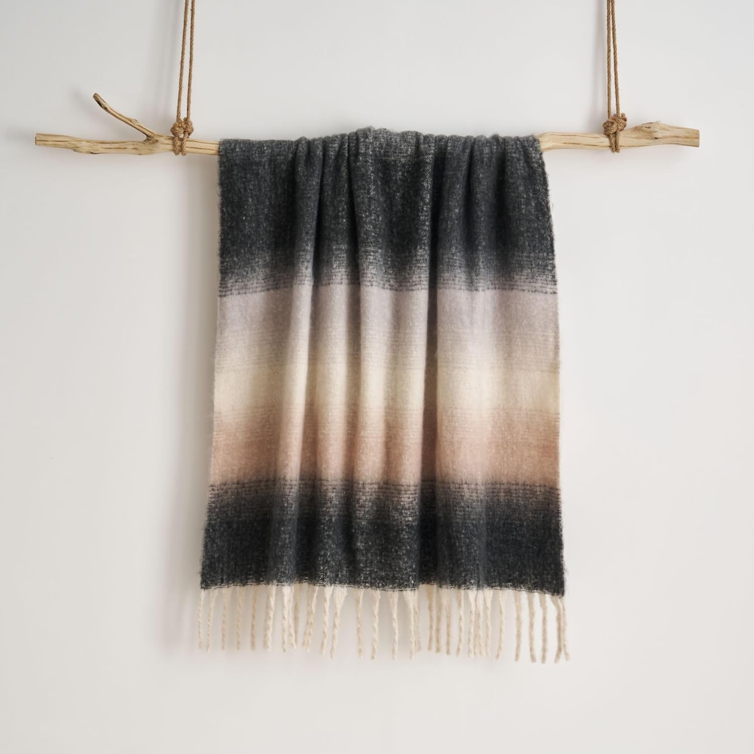 The design is through the full throw with navy blue fringes to either end of the blanket