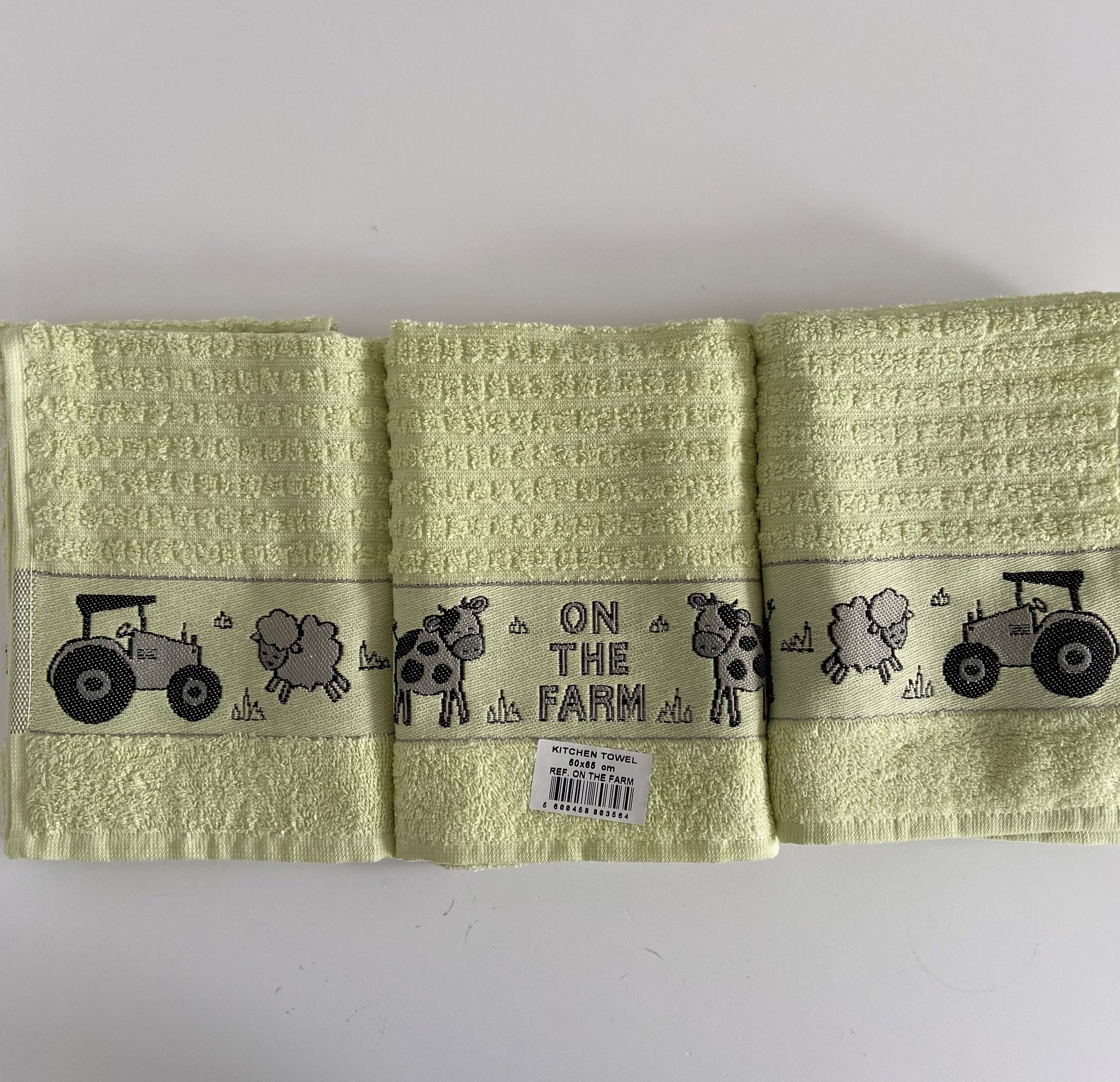 - Colour is green with a band of farm animals and tractors and the phrase 'ON THE FARM' to the bottom of the towel